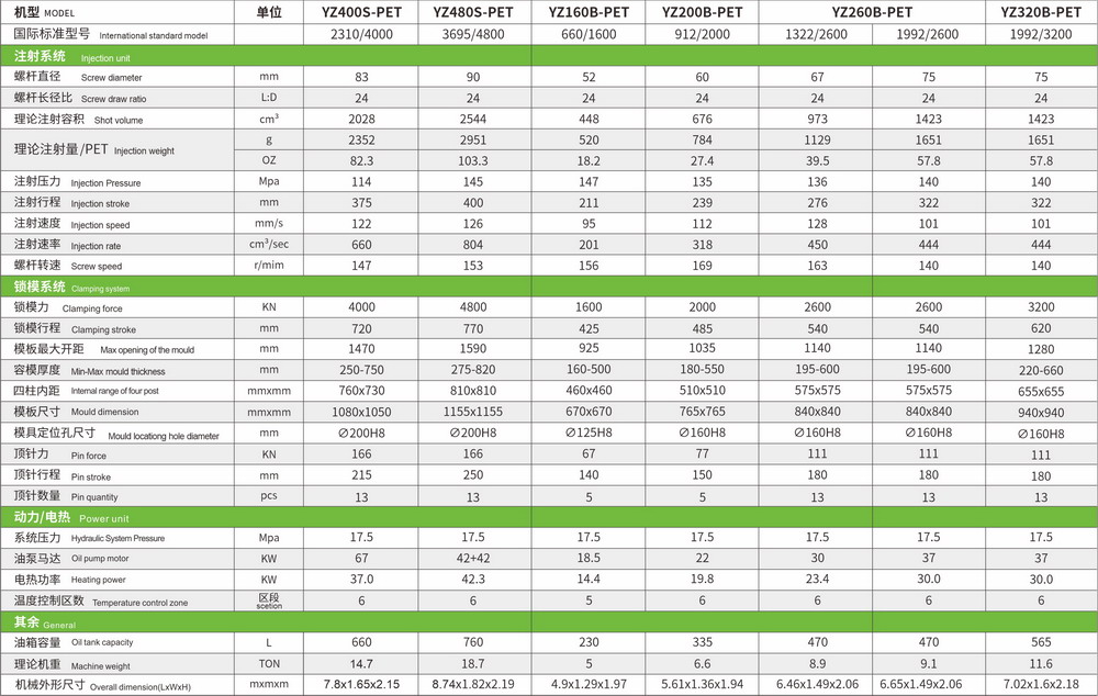 PET機(jī)型參數(shù)表(適用于飲料瓶、油瓶)